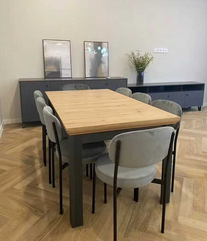 Нетривиальное сочетание классики и скандинавских мотивов: столешницы с древесной текстурой, изящные гофрированные планки, металлические ручки и стильные ножки. Насыщенный графитовый цвет фасадов и фурнитура с системой плавного закрывания — отличительные особенности коллекции Jasmin, выполненной в «темном скандинавском» стиле.