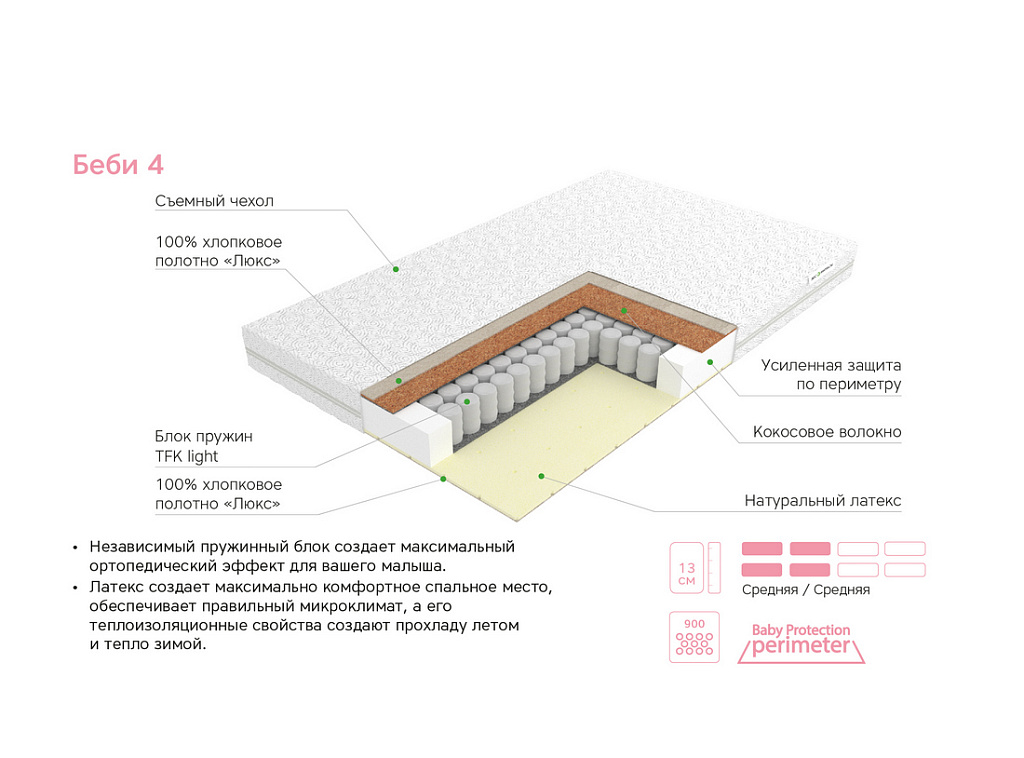 Натуральный материал, состоящий из нескольких слоёв спрессованной хлопковой нити. Изолирует чехол матраса от шероховатостей других наполнителей, применяется для водной и воздушной регуляции, обеспечивает идеальный микроклимат.