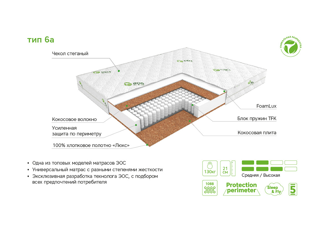 | Материал | Блок независимых пружин, Хлопковое полотно, Чехол, FoamLux, Кокосовое волокно, Латексированная кокосовая плита, Усиление по периметру матраса |